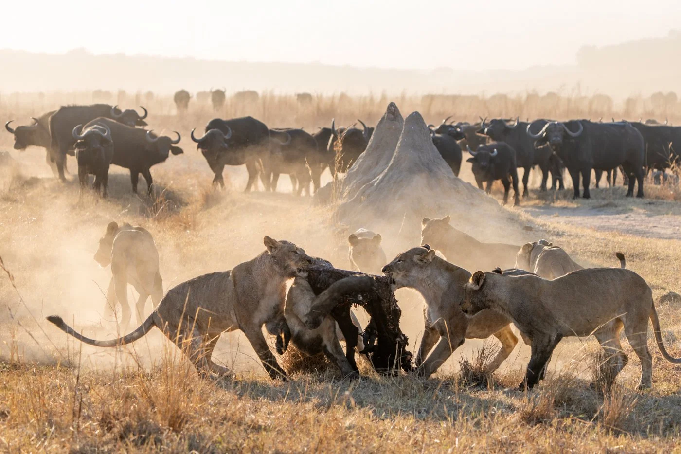 A pride of 11 lions takes down a buffalo on the Amalinda Safari Collection private concession